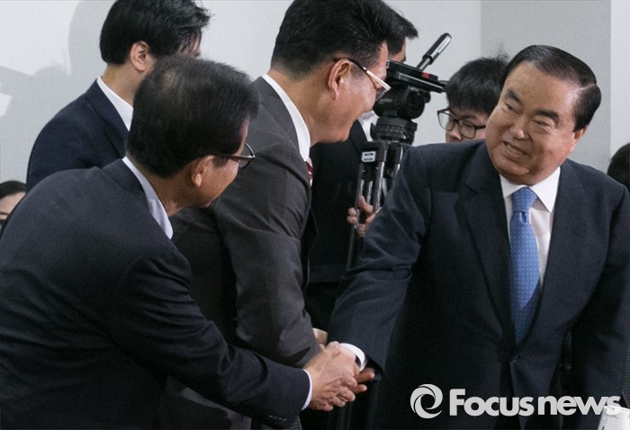 (서울=포커스뉴스) 29일 오전 서울 여의도 국회 의원회관에서 전당대회 연기론 등 논의를 위해 진행된 더불어민주당 4선 이상 중진모임에 참석한 문희상(오른쪽부터) 의원, 송영길 당선인, 원혜영 의원이 인사하고 있다. 이날 모임에는 강창일, 변재일, 이상민, 안민석, 설훈, 박병석, 오제세, 이상민, 문희상 의원과 김진표, 송영길 당선인 등이 참석했다.