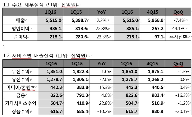 전체 매출은 상품 수익의 감소에도 불구하고 전년 동기 대비 2.2% 증가한 5조5150억원을 기록했고, 유선사업을 제외한 전 분야의 성장으로 전체 서비스매출은 전년 동기 대비 3.9% 성장했다.