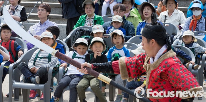 (서울=포커스뉴스) 28일 오전 서울 중구 남산골한옥마을에서 열린 '충무공 탄생 471주년 기념 다례식'에서 무예공연이 펼쳐지고 있다.