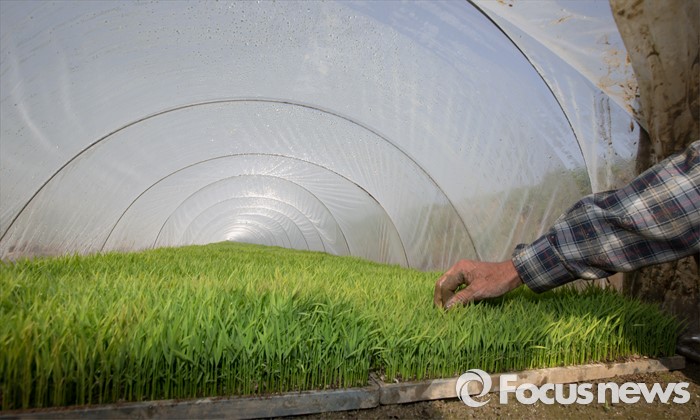 (파주=포커스뉴스) 25일 오전 경기도 파주시 오두산 인근 논밭에서 한 농부가 비닐하우스에 있는 벼들을 위해 공기를 환기시키고 있다.