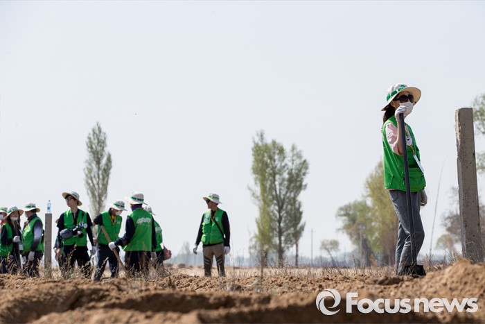 (다라더치/중국=포커스뉴스) 25일 오전 중국 내몽고 다라더치 쿠부치사막에서 2016 미래숲 15기 녹색봉사단원들이 나무 심기 작업을 하고 있다. 미래숲 녹색봉사단은 이번 봉사활동을 통해 황폐화된 사막에 나무 심기 및 각국 청년들과 우호를 증진을 위한 교류 활동을 전개했다.