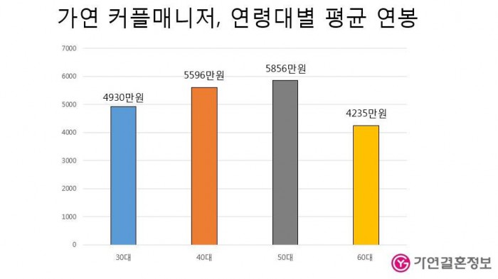 가연에 따르면, 지난해 커플매니저 평균 연봉은 4690만원이었다. 특히, 40대와 50대의 평균 연봉은 각각 5596만원, 5856만원으로, 이는 2014년 국세청이 발표한 40대, 50대 여성 평균 임금인 2500만원, 2250만원의 2배가 넘었다.