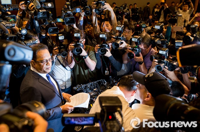 (서울=포커스뉴스) 2일 오전 서울 영등포구 콘래드호텔에서 열린 '옥시레킷벤키저(현 RB코리아) 가습기 살균제 파동' 관련 기자회견에서 아타 울라시드 사프달 옥시코리아 대표가 피해자 가족들에게 항의 받고 있다.