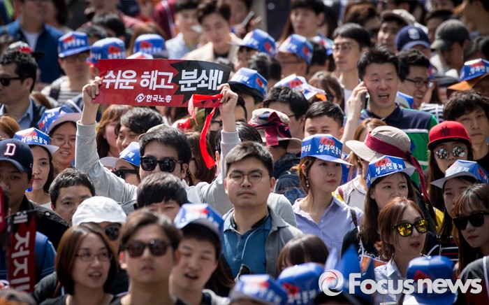 (서울=포커스뉴스) 근로자의날을 맞은 1일 오후 서울광장에서 열린 한국노총 5.1 전국노동자대회를 마친 참가자들이 종로로 행진을 이어가고 있다.