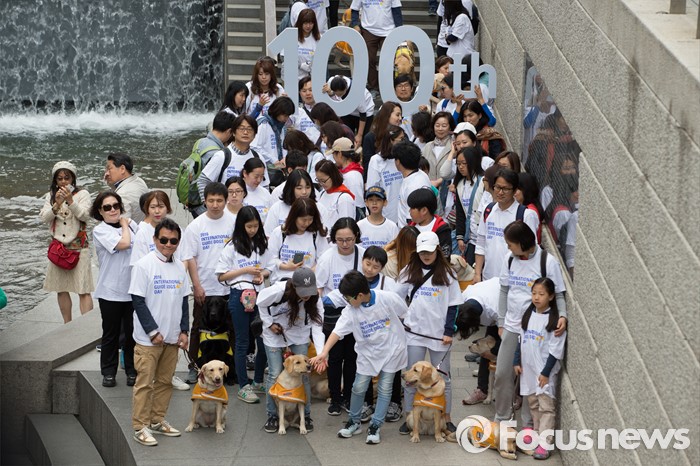 (서울=포커스뉴스) 27일 오전 서울 청계천에서 삼성화재안내견학교 훈련사들과 안내견들이 시민들과 함께 '안내견과의 만남' 행사를 하고 있다.