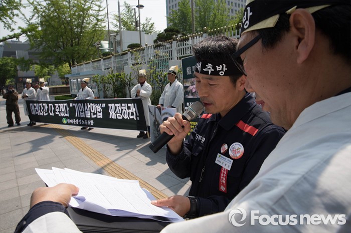 (서울=포커스뉴스) 29일 오후 서울 종로구 정부서울청사 앞에서 상경한 현대중공업노조원들이 구조조정 중단 및 산업현장 안정을 촉구하며 기자회견을 하고 있다.