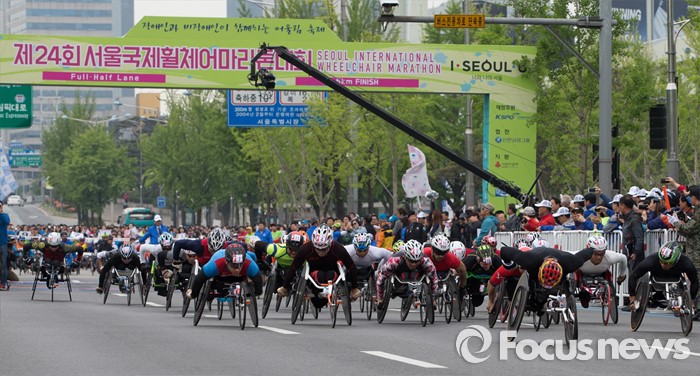 (서울=포커스뉴스) 30일 오전 서울 송파구 잠실종합운동장 인근에서 열린 '제24회 서울국제휠체어마라톤대회'에서 참가자들이 힘차게 출발하고 있다.