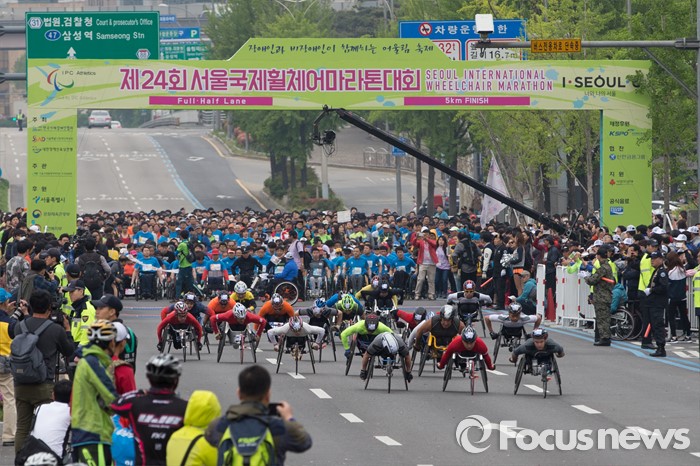 (서울=포커스뉴스) 30일 오전 서울 송파구 잠실종합운동장 인근에서 열린 '제24회 서울국제휠체어마라톤대회'에서 참가자들이 힘차게 출발하고 있다.
