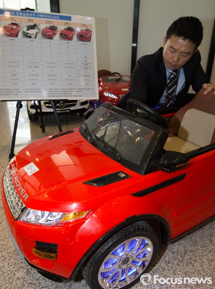 (세종=포커스뉴스) 2일 오전 세종시 정부세종청사 공정거래위원회에서 한국소비자원 관계자가 어린이 전동 승용완구 성능 및 안전성 등 제품별 차이를 설명하고 있다.