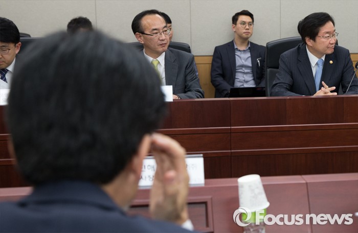 (세종=포커스뉴스) 김영석 해양수산부 장관이 25일 오후 세종시 정부세종청사 해수부 중회의실에서 열린 해운시장 및 해운동맹 재편 관련 대책회의에서 모두발언 중에 정세화 한진해운신항만 사장이 고민하는 모습을 보이고 있다.