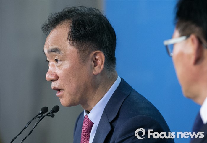 (서울=포커스뉴스) 정장선(왼쪽) 더불어민주당 총무본부장과 박광온 대변인이 27일 오전 서울 여의도 국회 정론관에서 전당대회 일정 등과 관련 브리핑을 하고 있다.