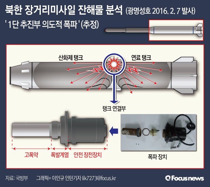 (서울=포커스뉴스) 27일 국방부는 북한이 지난 2월 7일 발사한 장거리 미사일의 잔해를 분석한 결과 위성개발 목적이 아닌 장거리탄도미사일 개발을 위한 것이라고 결론을 내렸다. 또 우리군이 수거하지 못하도록 미사일 1단 추진부를 의도적으로 폭파한 흔적도 발표했다.