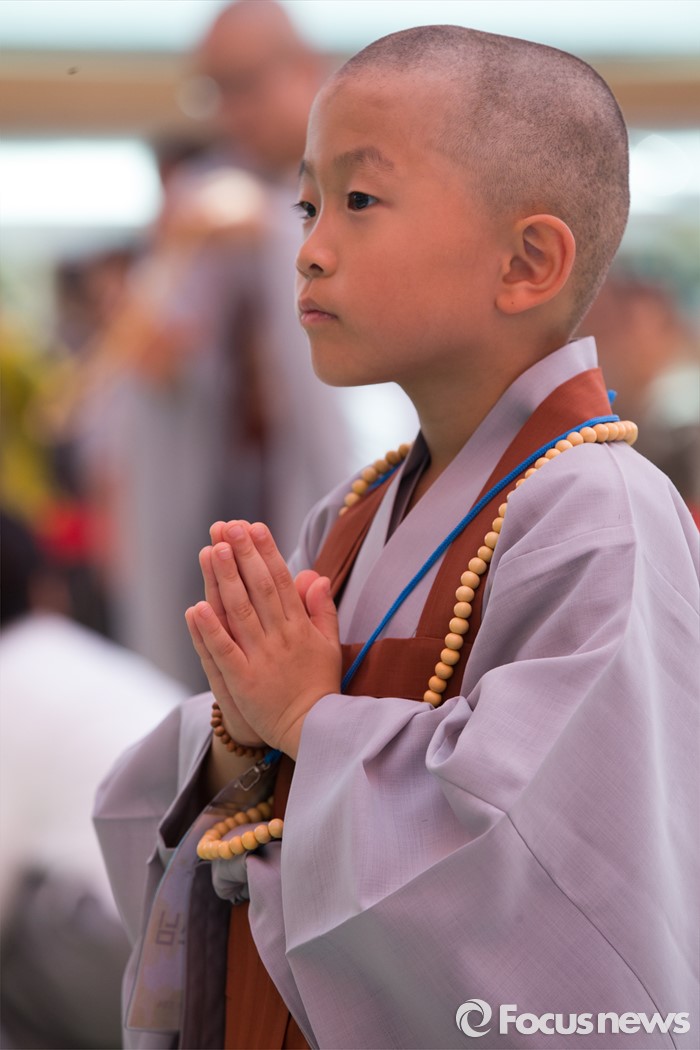(서울=포커스뉴스) 2일 오전 서울 종로구 조계사 대웅전 앞마당에서 열린 동자승 단기출가 보리수 새싹학교 삭발, 수계식에서 동자승이 삭발식을 끝내고 합장하고 있다.