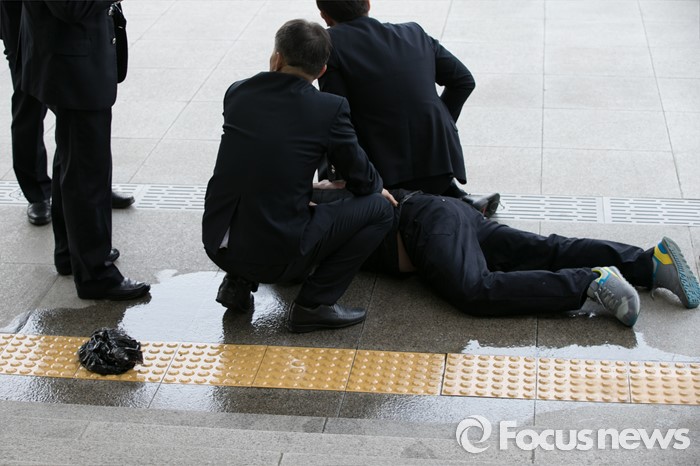 (서울=포커스뉴스) 25일 오후 서울 여의도 국회 의원회관 앞에서 신원 미상의 한 중년 남성이 분신 시도를 하려다, 국회 방호원들에게 제압당하고 있다.