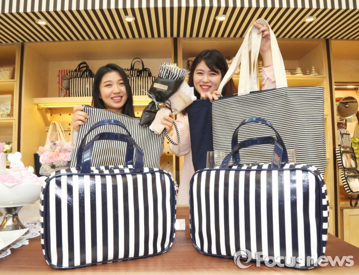 AK플라자 관계자는 “스트라이프 앤 스트라이프 개장은 디자인을 통한 AK플라자의 정체성 구현”이라며 “이 같은 새로운 시도를 통해 앞으로 다양한 분야의 얘술가와 디자이너, 셀러브리티들과 협업으로 한정판 제품을 개발하는 등 상품 차별화에 역점을 둘 것”이라고 말했다.4월30일 AK플라자 분당점 2층에 개장한 스트라이프 전문 라이프스타일 매장인 스트라이프 앤 스트라이프에서 모델들이 스트라이프 패턴의 가방 등을 선보이고 있다.<사진제공=AK>