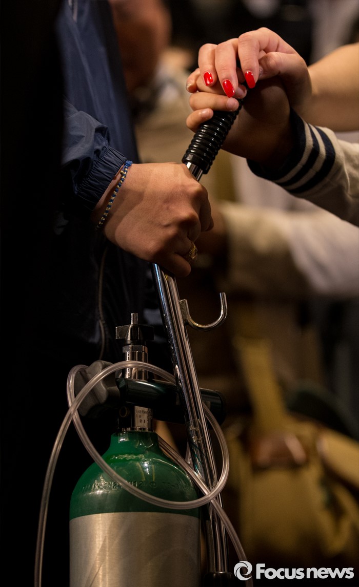 (서울=포커스뉴스) 2일 오전 서울 영등포구 콘래드호텔에서 열린 '옥시레킷벤키저(현 RB코리아) 가습기 살균제 파동' 관련 기자회견에서 피해자 임성준 군이 산소통을 붙들고 있다.