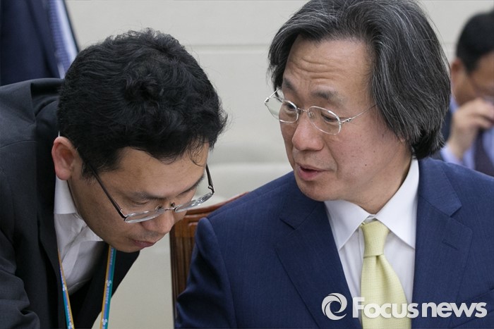 (서울=포커스뉴스) 정기석(오른쪽) 질병관리본부장이 29일 오후 서울 여의도 국회에서 지카바이러스 관련 현안보고를 위해 보건복지위원회 전체회의에 출석해, 직원과 대화하고 있다.