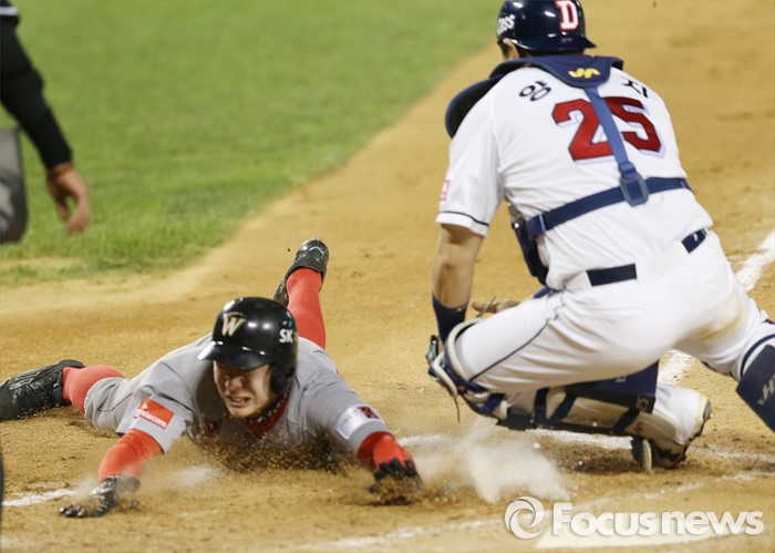 (서울=포커스뉴스) 26일 서울 잠실구장에서 열린 2016 프로야구 SK-두산 경기9회초 1사 3루에서 SK 최승준의 유격수앞 땅볼때 3루주자 유서준이 홈으로 뛰어들다 아웃되고 있다.