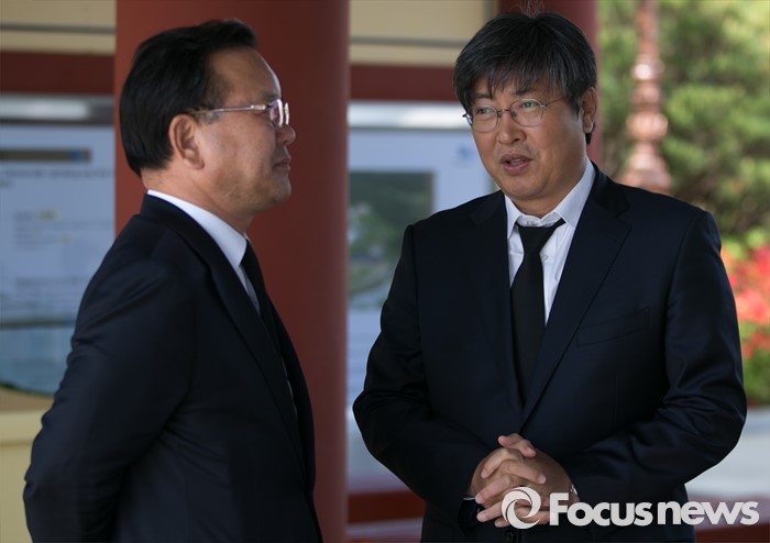 (광주=포커스뉴스) 이춘석(오른쪽) 더불어민주당 원내수석부대표와 김부겸 당선인이 25일 오전 광주 북구 국립 5·18민주묘지를 방문해 김종인 비대위 대표를 기다리며 대화하고 있다.