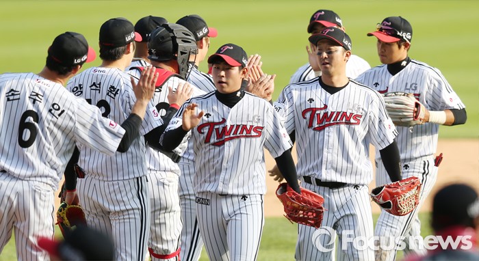(서울=포커스뉴스) 1일 서울 잠실구장에서 열린 2016 프로야구 kt-LG 경기에서 kt에 승리한 LG 선수들이 하이파이브하고 있다.