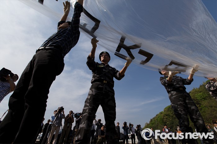 (파주=포커스뉴스) 29일 오후 경기 파주 낙하IC 인근에서 탈북자단체인 자유북한운동연합이 북한에 핵과 미사일을 포기하고 국제사회 일원으로 참여할 것을 촉구하는 내용의 대북전단을 날려보내기 위해 수소가스를 주입하고 있다.