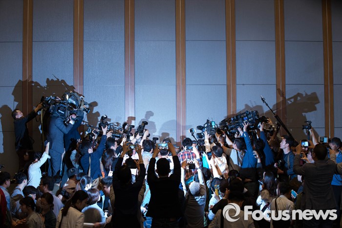 | △ 취재진 속에 파묻힌 옥시 한국법인장 |