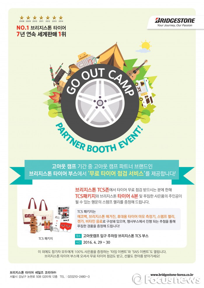브리지스톤 코리아는 고아웃 캠프 현장에 홍보 부스를 마련하고, 브리지스톤 타이어를 장착한 차량에 무료 타이어 점검 서비스를 진행한다. 또한 브리지스톤 타이어 부스에는 브리지스톤 친환경 SUV타이어인 '에코피아 HL 422 Plus'를 장착한 토요타 2016 올 뉴 라브4 하이브리드가 전시될 예정이다.