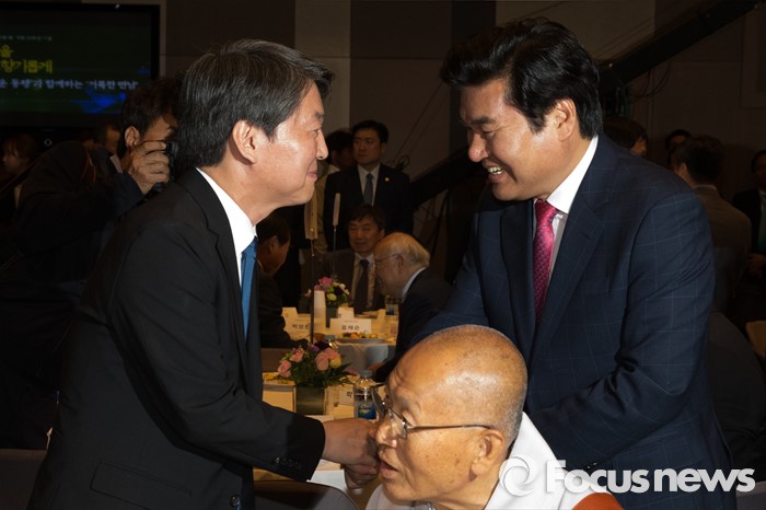 (서울=포커스뉴스) 2일 오후 서울 중구 프레스센터에서 열린 BBS 불교방송 개국 26주년 기념 비전선포식에 참석한 원유철(오른쪽) 새누리당 원내대표와 안철수 국민의당 상임공동대표가 악수하고 있다.