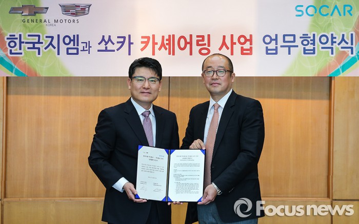 (서울=포커스뉴스) 한국GM은 카셰어링 기업 쏘카와 차량, 카셰어링 상품의 판매 촉진에 관한 업무 협약을 맺었다고 28일 밝혔다.