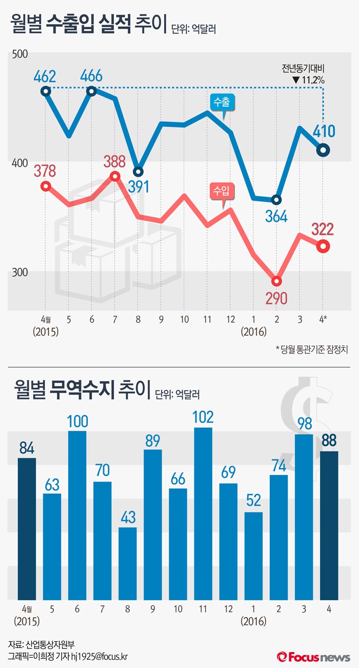 이어 “글로벌 경기부진, 저유가 기조 지속, 월초 연휴 효과, 선박 추가 차질 가능성 등으로 5월 수출여건도 녹록치 않은 상황”이라고 덧붙였다.수출을 위해 항만에 대기 중인 선적물. ⓒ게티이미지/멀티비츠 (서울=포커스뉴스) 1일 산업통상자원부가 발표한 '2016년 4월 수출입동향'에 따르면 4월 수출액은 410억달러로 전년동월대비 11.2% 감소를 기록했다. 수입액은 지난해 같은 기간보다 14.9% 줄어든 322억달러, 무역수지는 88억달러였다. 2016.05.01 이희정 기자