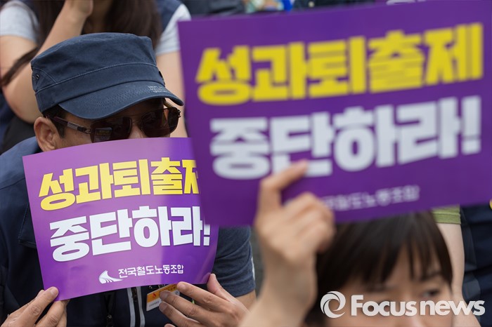 (서울=포커스뉴스) 30일 오후 서울역 광장에서 민주노총 공공운수 전국철도노동조합 회원들이 '철도노동자 1차 총력 결의대회'를 하고 있다.