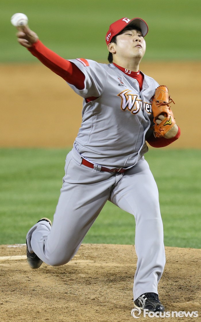 (서울=포커스뉴스) 27일 서울 잠실구장에서 열린 2016 프로야구 SK-두산 경기에서 SK 투수 박민호가 7회 2사후 마운드에 올라 투구하고 있다.