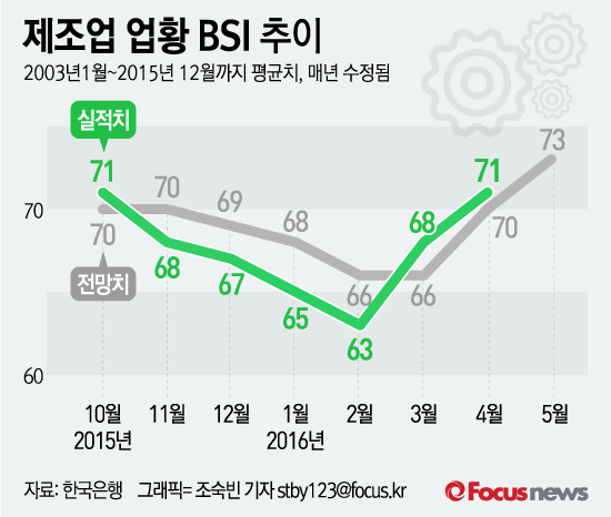 (서울=포커스뉴스) 29일 한국은행이 낸 ‘2016년 4월 기업경기실사지수(BSI) 및 경제심리지수(ESI)’에 따르면 올해 4월 제조업의 업황 기업경기실사지수(BSI)는 71로 전달보다 3포인트 상승했다.