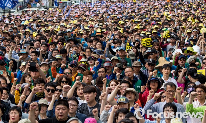 (서울=포커스뉴스) 근로자의날을 맞은 1일 오후 서울 종로구 대학로에서 민주노총 주최로 열린 '2016 세계노동절대회' 참가자들이 구호를 외치고 있다.