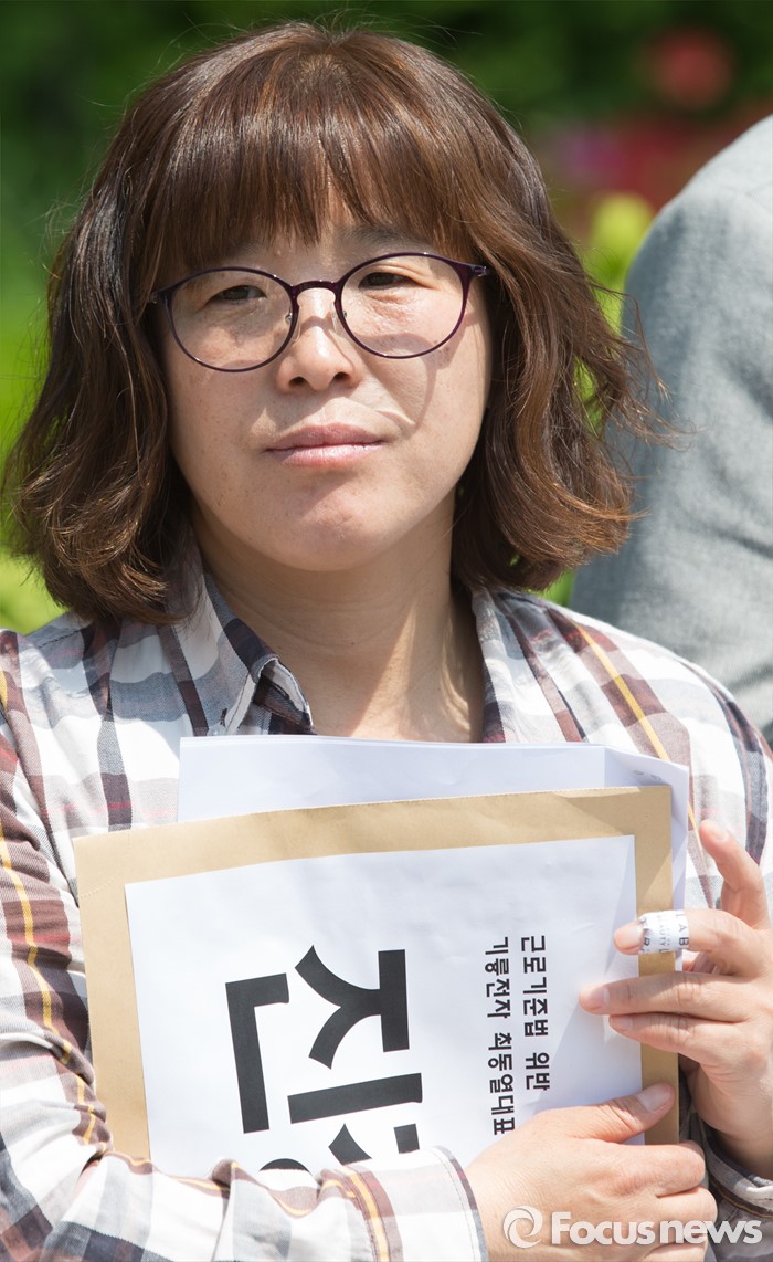 (서울=포커스뉴스) 29일 오전 서울 서초구 서울중앙지검 앞에서 열린 '불법 기업주 강력 처벌 촉구, 유흥희 분회장 항의 노역' 기자회견에 참석한 유흥희 기륭전자 노조분회장이 진정서를 들고 있다.