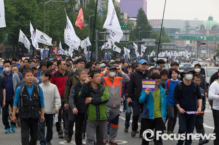 (서울=포커스뉴스) 30일 오후 서울역 광장에서 민주노총 공공운수 전국철도노동조합 회원들이 '철도노동자 1차 총력 결의대회'를 마치고 시내를 행진하고 있다.