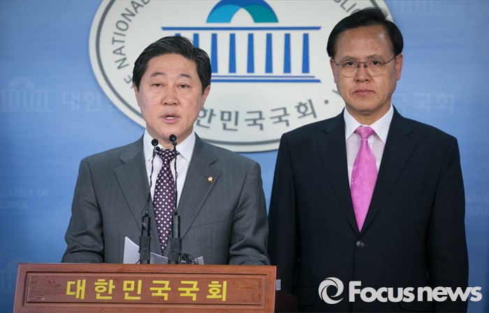 (서울=포커스뉴스) 유기준(왼쪽) 새누리당 의원이 28일 오후 서울 여의도 국회 정론관에서 정책위의장 러닝메이트 후보인 이명수 의원과 원내대표 출마 기자회견을 하고 있다.