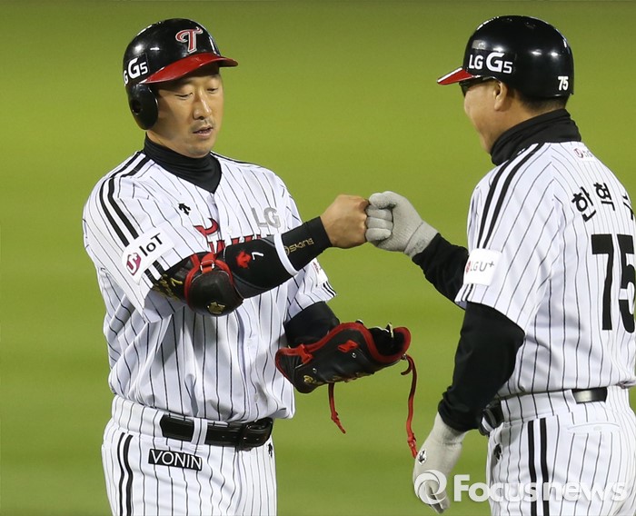 (서울=포커스뉴스) 29일 서울 잠실구장에서 열린 2016 프로야구 kt-LG 경기 7회말 1사 만루에서 LG 이병규가 2타점 우전안타를 치고 2루에서 한혁수 코치와 주먹을 마주치고 있다.