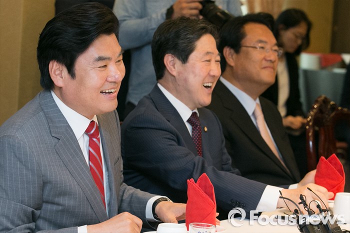 (서울=포커스뉴스) 원유철(왼쪽) 새누리당 원내대표가 25일 오후 서울 여의도의 한 중식당에서 열린 중진의원 오찬 간담회에 참석해 크게 웃고 있다.