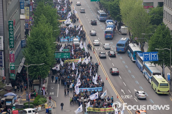 (서울=포커스뉴스) 30일 오후 서울역 광장에서 민주노총 공공운수 전국철도노동조합 회원들이 '철도노동자 1차 총력 결의대회'를 마치고 시내를 행진하고 있다.