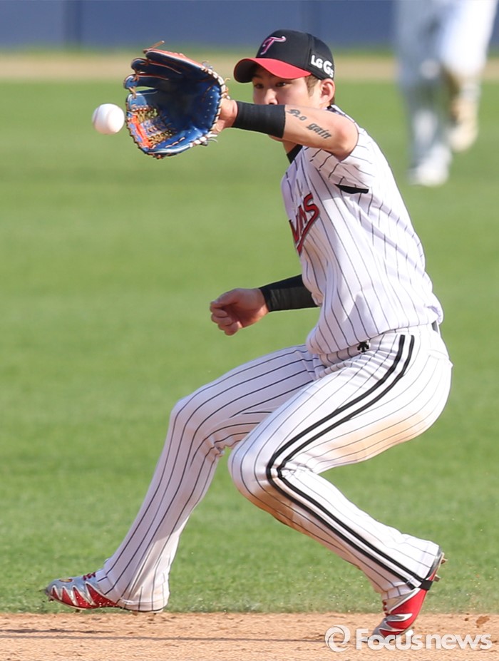 (서울=포커스뉴스) 1일 서울 잠실구장에서 열린 2016 프로야구 kt-LG 경기 9회초 2사 1루에서 LG 유격수 오지환이 kt 김종민의 깊숙한 내야 땅볼 타구를 잡고 있다.