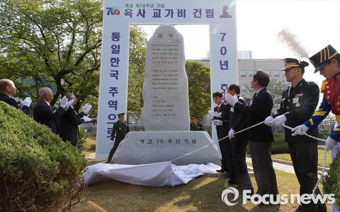 (서울=포커스뉴스) 29일 오후 서울 노원구 육군사관학교에서 최병로 육군사관학교장을 비롯한 내빈들이 개교 70주년 기념 교가비 제막을 하고 있다.