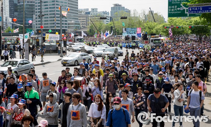 (서울=포커스뉴스) 근로자의날을 맞은 1일 오후 서울광장에서 열린 한국노총 5.1 전국노동자대회를 마친 참가자들이 종로로 행진을 이어가고 있다.