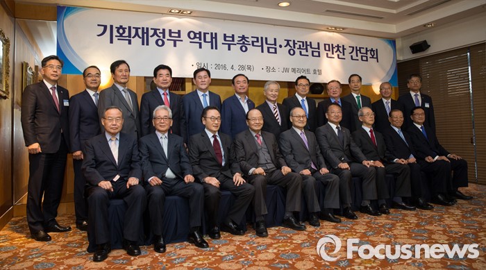 (서울=포커스뉴스) 유일호 경제부총리 겸 기획재정부 장관(앞줄 왼쪽 여섯째)이 28일 오후 서울 서초구 JW매리어트호텔에서 열린 '역대 부총리·장관 초청 간담회'에서 참석자들과 함께 기념촬영을 하고 있다.