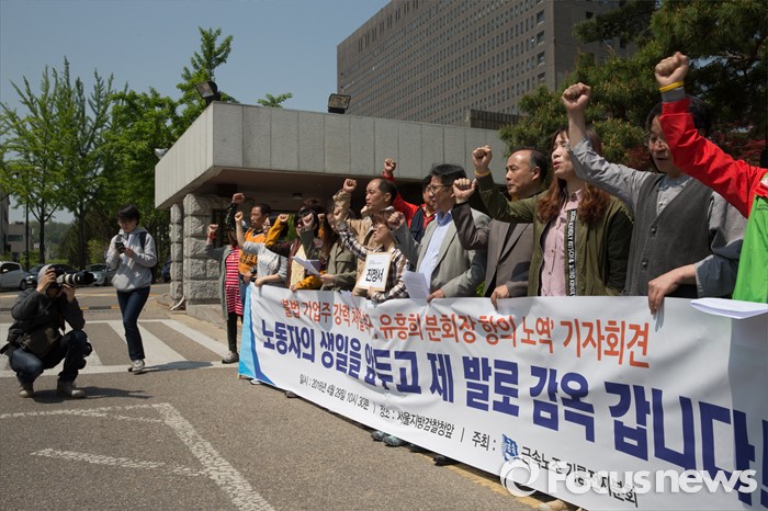 (서울=포커스뉴스) 29일 오전 서울 서초구 서울중앙지검 앞에서 열린 '불법 기업주 강력 처벌 촉구, 유흥희 분회장 항의 노역' 기자회견 참석자들이 관련 구호를 외치고 있다.