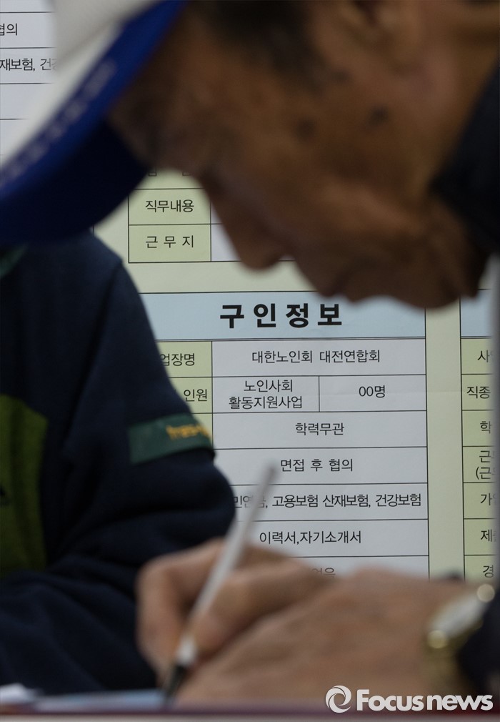 (대전=포커스뉴스) 28일 오후 대전 서구 노인복지관 3층 대강당에서 열린 찾아가는 시니어 취업 박람회를 찾은 구직희망자가 이력서를 작성하고 있다.
