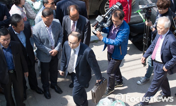 (부여=포커스뉴스) 29일 오후 이완구 전 국무총리가 2013년 재보궐 선거 때 사용한 충남 부여 선거사무소에서 서울고법 형사2부 관계자들이 현장검증을 실시하기 위해 선거사무소로 이동하고 있다.