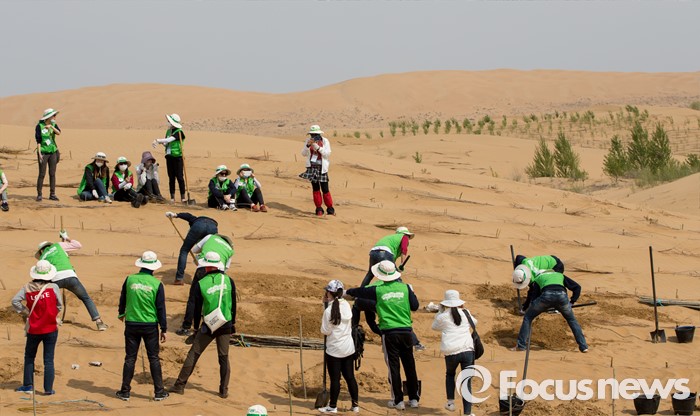 (다라더치/중국=포커스뉴스) 25일 오후 중국 내몽고 다라더치 쿠부치사막에서 2016 미래숲 15기 녹색봉사단원들이 나무 심기 작업을 하고 있다. 미래숲 녹색봉사단은 이번 봉사활동을 통해 황폐화된 사막에 나무 심기 및 각국 청년들과 우호를 증진을 위한 교류 활동을 전개했다.