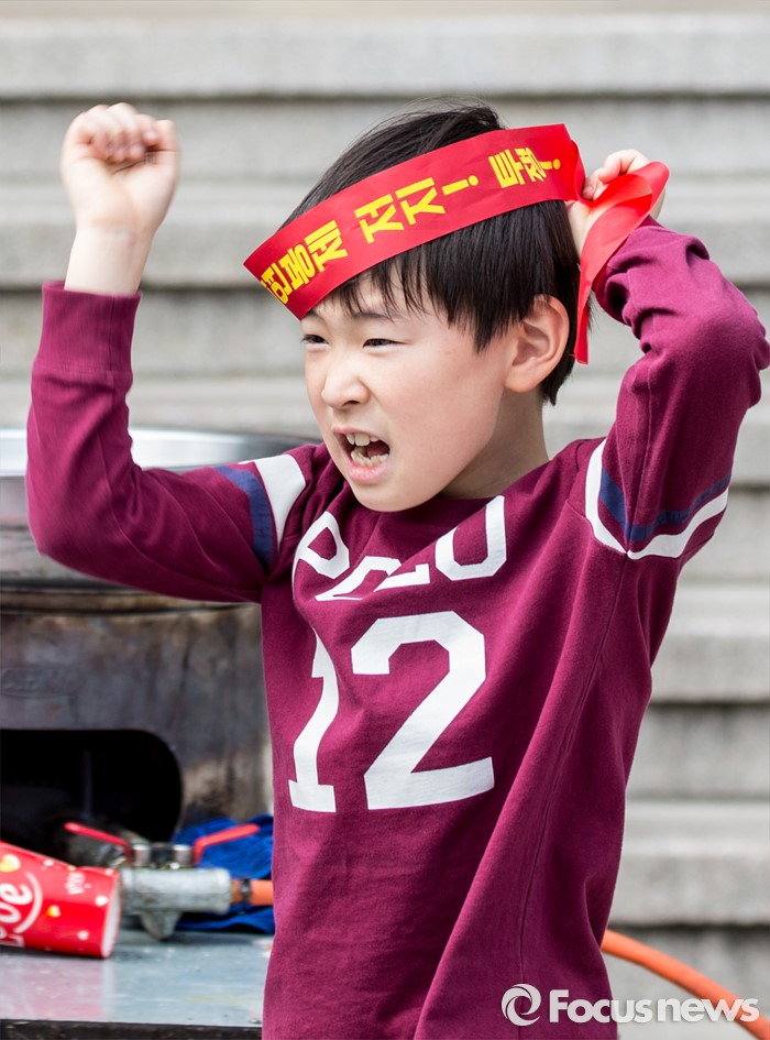 (서울=포커스뉴스) 근로자의날을 맞은 1일 오후 서울광장에서 열린 한국노총 5.1 전국노동자대회에 참가한 어린이기 머리띠를 가지고 놀고 있다.