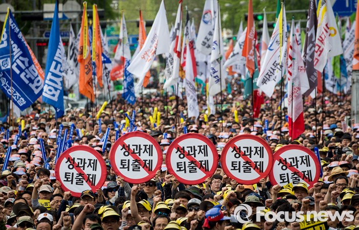 (서울=포커스뉴스) 근로자의날을 맞은 1일 오후 서울 종로구 대학로에서 민주노총 주최로 열린 '2016 세계노동절대회' 참가자들이 구호를 외치고 있다.